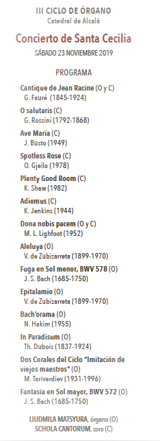 V.Zubizarreta – ALELUYA-, J.S.Bach – FUGA EN SOL MENOR,BWV 578 N.Hakim – BACH´ORAMA EPITALAMIO de V.Zubizarreta (1899- 1970)